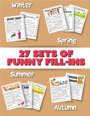 These ever-popular funny fill-in-the-blank ad lib stories for kids are engaging, entertaining, and create hysterical laughter during any occasion. This bundle of 170+ ad libs covers every season and nearly every holiday. They are guaranteed to keep your kids in stitches for months! It’s the perfect companion for travel, party games, boredom busters, classroom activities, and family entertainment. (So much hilarious amusement that your kiddo will never know they’re practicing vocabulary skills.)