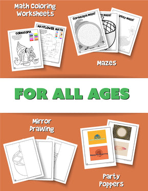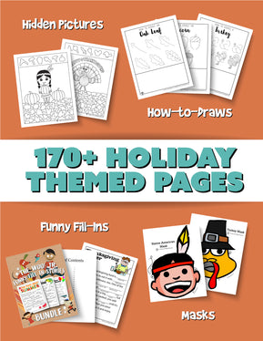 This bundle of 170+ Thanksgiving-themed activities will entertain your kids for hours. They’ll be engaged in pumpkin, turkey and autumn themed activities that include coloring pages, fun worksheets, puzzles, decoration printables and many more activity pages. Perfect time filling projects during the Thanksgiving season for kids at home, in the classroom or young guests who are visiting to celebrate the holiday.